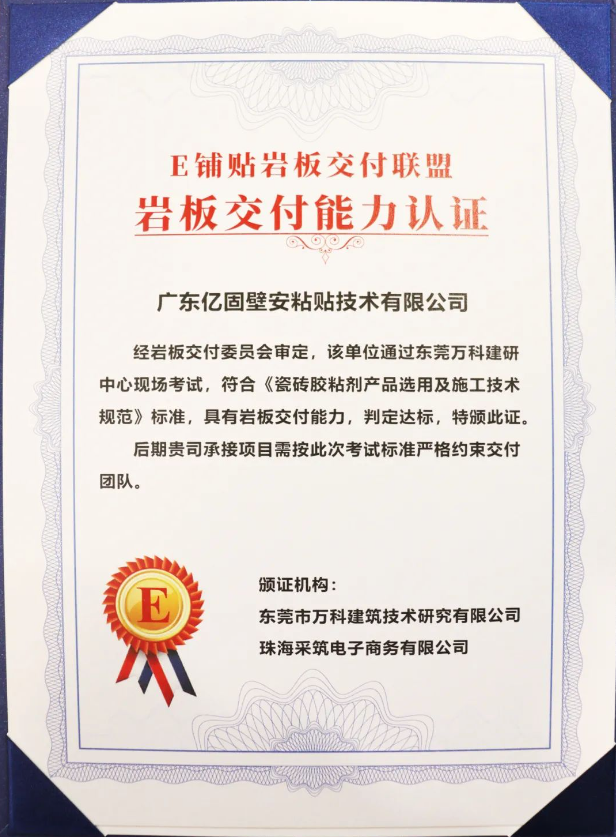 近日,廣東億固壁安粘貼技術有限公司榮獲東莞市萬科建筑技術研究有限公司、珠海采筑電子商務有限公司聯(lián)合頒發(fā)的“巖板交付能力認證”證書,且“E鋪貼”巖板交付聯(lián)盟判定億固具有巖板交付能力。